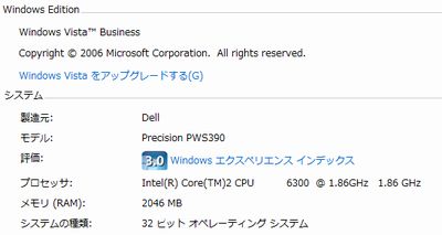 評価のWindows エクスペリエンス インデックスは「3.0」出ております。メモリ(RAM)は2046MB(2G)です。
